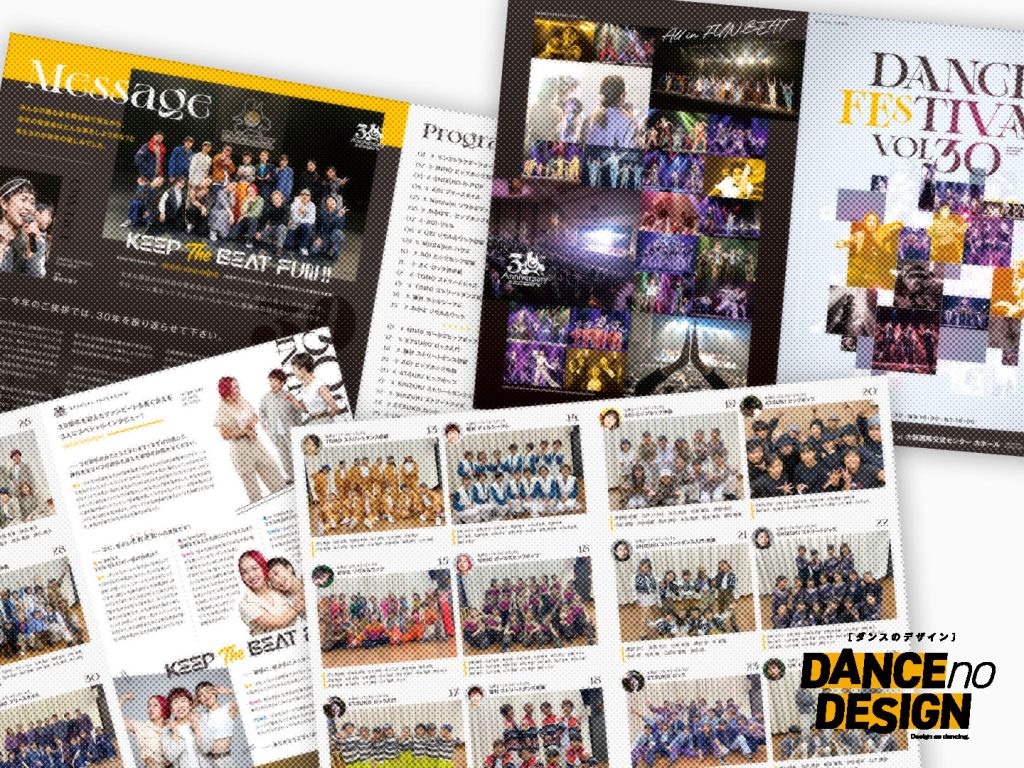 発表会におけるデザインのコアアイテムであるパンフレットには、表紙のキービジュアルをはじめ、代表挨拶、プログラム、クラス写真、講師からのコメント、レポート、アルバム、インフォメーションなど、多様な情報が掲載されています。
